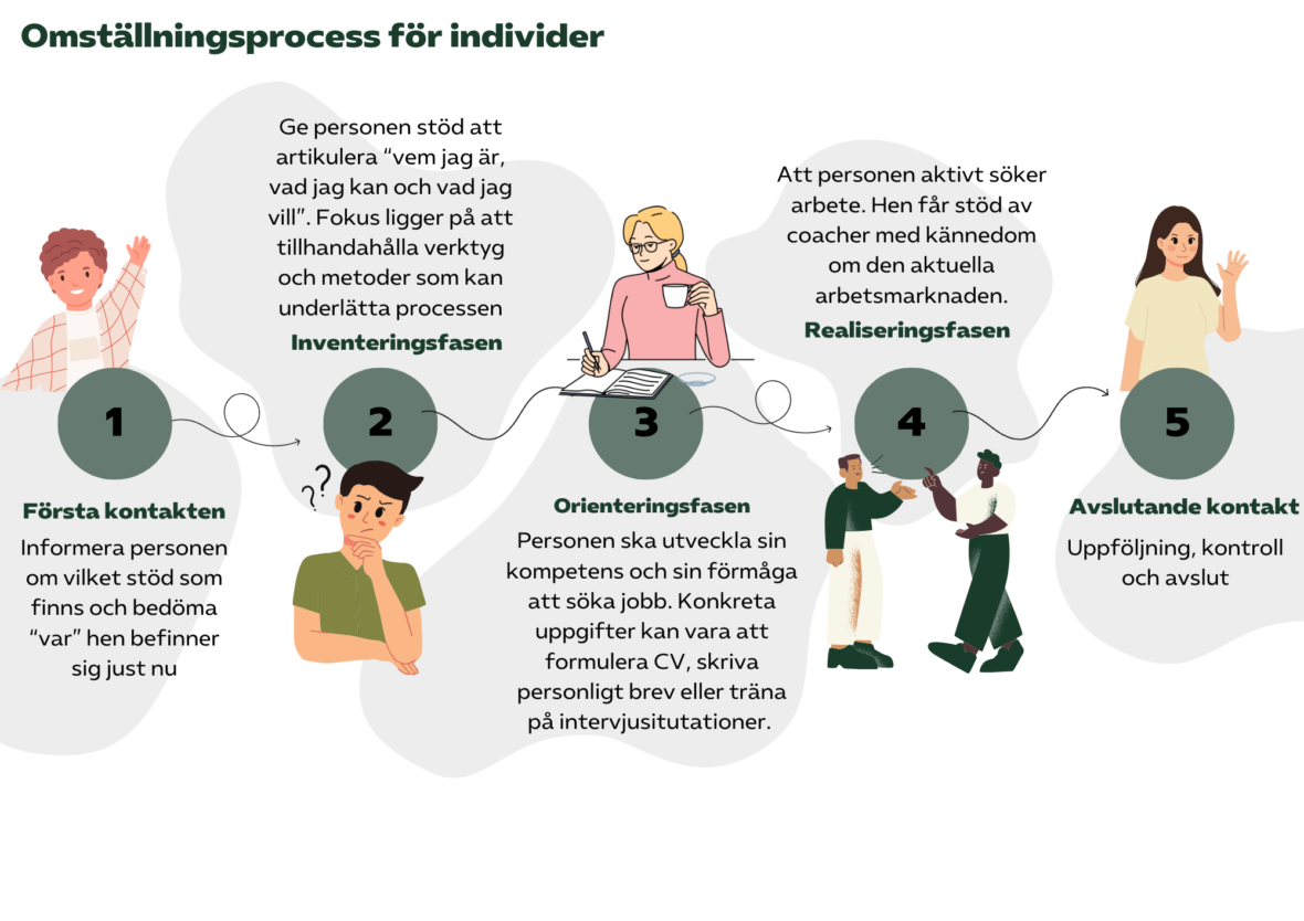 Omställningen innehåller oftast fem faser, från den inledande informationen till den avslutande kontakten. I stöttningen som den arbetssökande får kan det ingå allt från språkstöttning, hur en skriver en jobbansökan eller helt enkelt matchning med ett jobb tack vare omställnings­företagens stora kontaktnät. Med digitalisering, mer specialisering och en arbetsmarknad i ständig förändring kommer byte av yrke att bli ett allt vanligare inslag i arbetslivet.