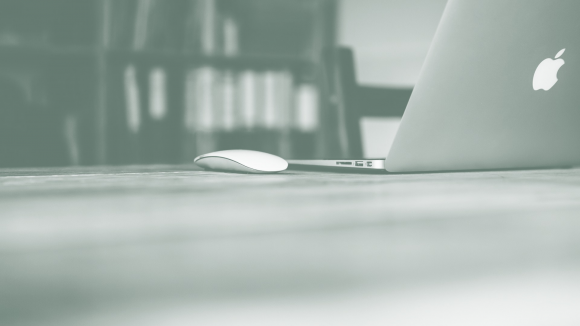 trådlös mus bredvid MAC-dator på skrivbord, allt i blekgrön ton