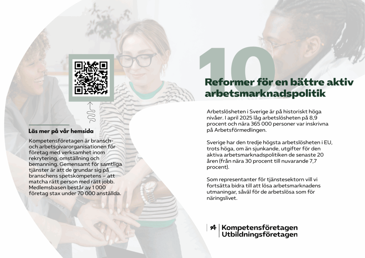 Som representanter för tjänstesektorn vill vi fortsätta att bidra till att lösa arbetsmarknadens utmaningar, för såväl samhället, företagen som alla arbetssökande.