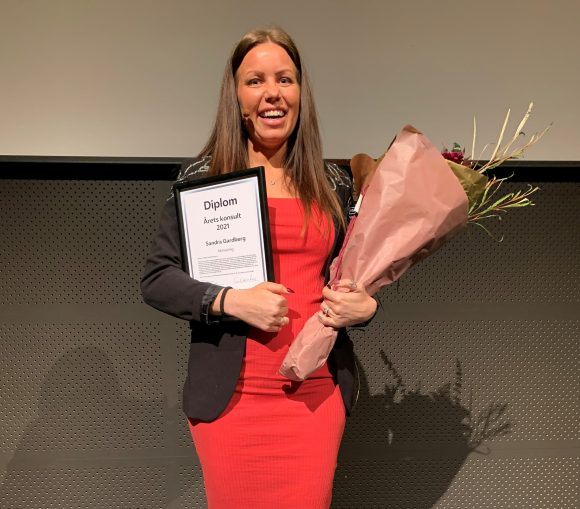 Sandra Gardberg, Årets konsult 2021 ler stort och håller i blommor och priser