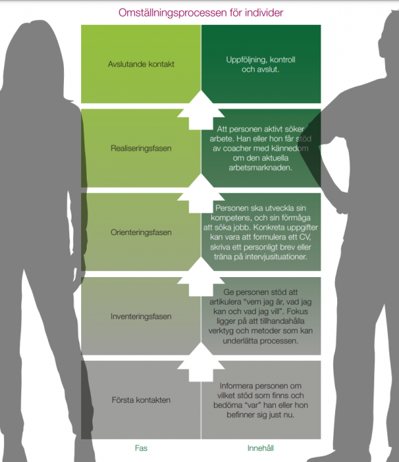 Omställningen innehåller oftast fem faser, från den inledande informationen till den avslutande kontakten. I stöttningen som den arbetssökande får kan det ingå allt från språkstöttning, hur en skriver en jobbansökan eller helt enkelt matchning med ett jobb tack vare omställnings­företagens stora kontaktnät. Med digitalisering, mer specialisering och en arbetsmarknad i ständig förändring kommer byte av yrke att bli ett allt vanligare inslag i arbetslivet.