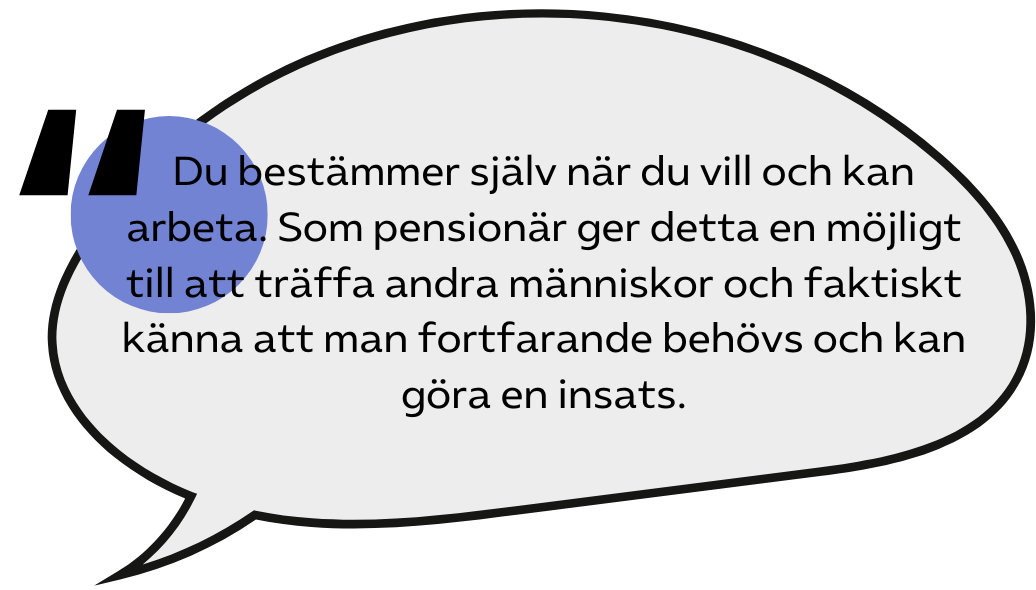 ”Fritt och omväxlande. Givande att få dela med sig av en bred erfarenhet och att få användning av kunskap förvärvad under en lång karriär.”
