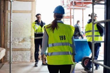 Kvinna med skyddshjälm och pappersark i handen står vänd med ryggen mot kameran och tittar på
